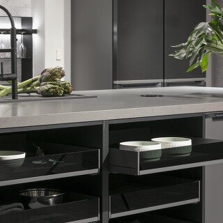 Typisch Minimalismus: die Reduktion auf geometrische Grundstrukturen, übertragen auf Küchendesign auch häufig in Farben wie Schwarz, Weiß oder Grau. Wenn das Frontenbild nicht durch Beschläge unterbrochen wird, wirkt die Küche besonders ruhig, elegant und modern. Die klassische Küchenfunktion tritt in den Hintergrund, was nicht heißt, dass diese ins Hintertreffen gerät. Sie ist nur nicht auf den ersten Blick sichtbar.