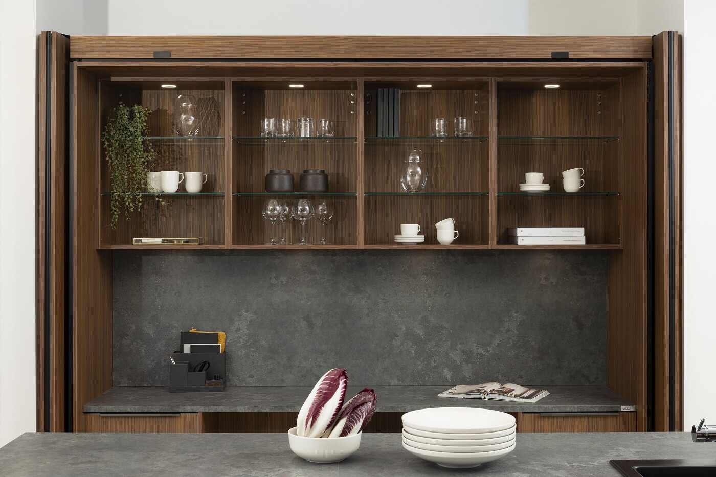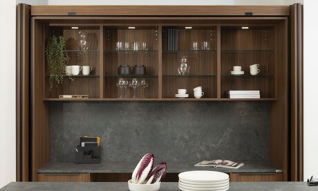 Ganz gleich welche Kücheneinheit Ihnen als ein eigener Schrank vorschwebt – der Frühstücksschrank, Backschrank, Teeschrank oder Weinschrank ...– auch Kühlgeräte lassen sich nach Bedarf integrieren. Schönerweise gibt es die dazu passenden Taschentüren – auch Einschubtüren oder Pocket Doors genannt – inzwischen in vielen verschiedenen Ausführungen, hier gezeigt in Edelnussbaum.