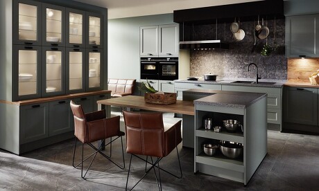 Statt dafür Trockenbauwände zu ziehen, können solche Aufteilungen auch per Küchenzeile geschaffen werden. Beim hier gezeigten Beispiel wird ein deckenhohes modernes Küchenbuffet als Raumteiler genutzt. Es entsteht eine von der Küche abgegrenzte Wohnzone mit praktischem Durchgang von der Küchenzeile aus.