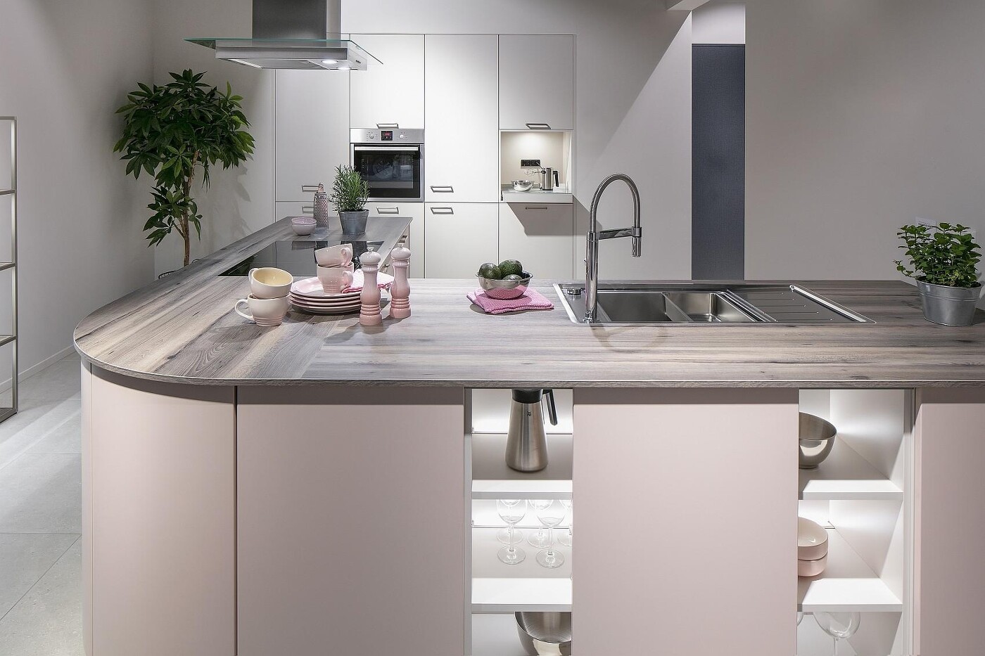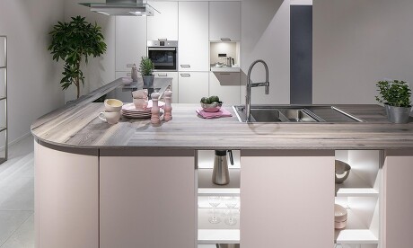 Küchenmöbel mit Abrundungen anstelle rechtwinkliger Ecken schaffen ein umso wohnlicheres Ambiente und vollenden den Landhausstil genauso wie sie einer modernen Inselküche das besondere Extra geben – wie dieses Beispiel zeigt. Grifflos und in grau abgetöntem Rosa gehalten kommt die abgerundete Küchenfront besonders schön zum Tragen.